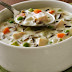 Quand elle est chaude, faire revenir les champignons, les pignons et les oignons émincés pendant 10 minutes en remuant. Saler et poivrer.